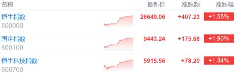 截止收盘,恒生指数涨1.55%上扬超400点报26649点,国企指数、恒生科技指数分别上涨1.9%及1.34%。