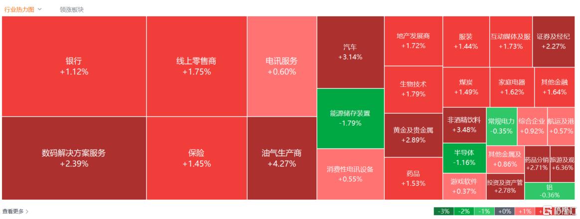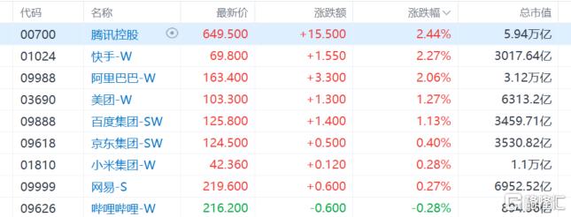 大型科技股普涨,腾讯、快手、阿里巴巴涨超2%,百度、美团涨超1%,京东、小米、网易跟涨。