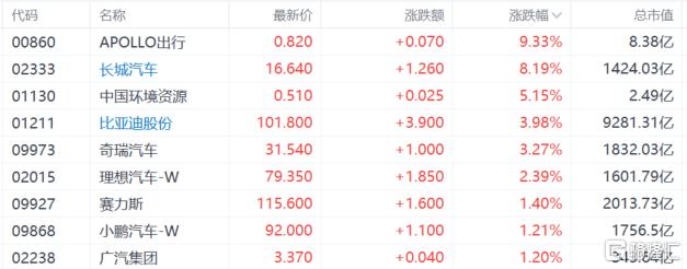汽车股走强,长城汽车涨超8%,比亚迪股份、奇瑞汽车涨超3%,理想汽车涨超2%。消息面上,乘联分会数据显示,10月新能源乘用车批发销量达到162.1万辆,同比增长18.5%,环比增长8.5%;1-10月累计批发1,205.8万辆,增长29.9%。