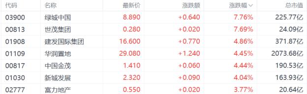 内房股上涨,绿城中国、世茂集团涨超7%,华润置地、中国金茂、新城发展涨超4%。中信证券发布研报称,房地产市场供需情况已经有所改善,调整也比较充分,预计2026年市场有止跌回稳的基础。中信证券认为,2026年房地产企业可能进入资产负债表修复的关键一年,部分企业可能见到盈利长周期底部。率先脱困的企业,往往布局好的城市,更具备正在良好运营的投资性房地产,或拥有一些有增值潜力的金融资产。