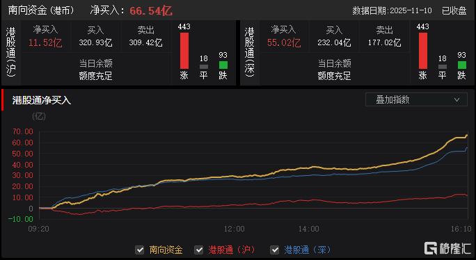 今日,南向资金净买入66.54亿港元,其中港股通(沪)净买入11.52亿港元,港股通(深)净买入55.02亿港元。