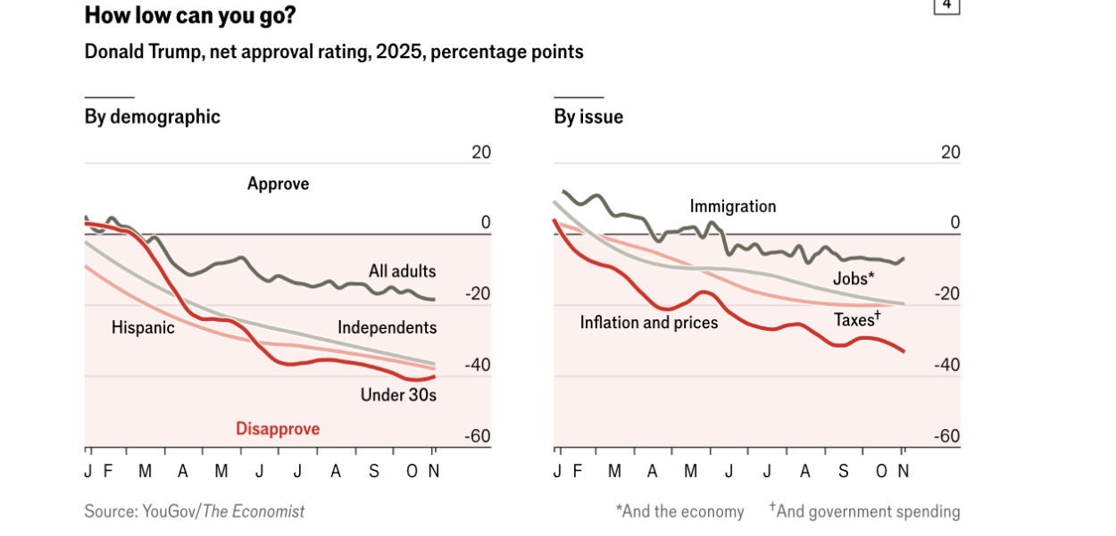 但11月4日举行的选举——也是明年中期选举前的最后一次,让民主党重新露出笑容。如今尘埃落定,《经济学人》的数据团队深入分析结果,探讨这是否意味着特朗普和共和党面临更大的麻烦。