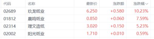 纸业股拉升,玖龙纸业涨超10%,晨鸣纸业、理文造纸、阳光纸业等跟涨。