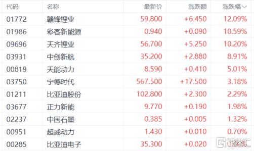 锂电池强势,赣锋锂业涨超12%,天齐锂业、中创新航、天能动力、宁德时代等跟涨。