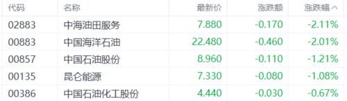 石油股低迷,中海油田服务、中国海洋石油跌超2%,中国石油股份、昆仑能源、中国石油化工股份等跟跌。