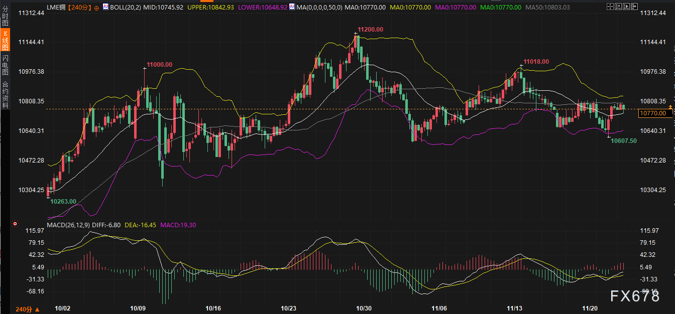 汇通财经APP讯——周一(11月24日),全球铜市呈现内强外弱、高位震荡的格局。伦敦金属交易所(LME)三个月期铜报价约为每吨10,760