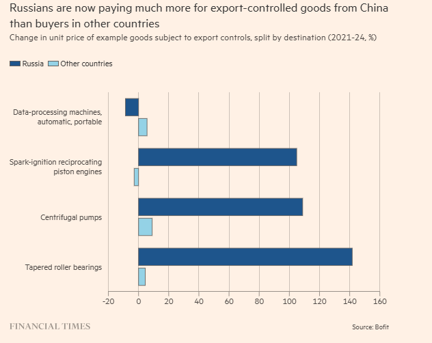 据金融时报,芬兰银行新兴经济研究所(Bofit)的一项最新研究,中国出口商在对俄罗斯军工行业的供应中大幅涨价,利用克里姆林宫对中国的依赖。在西方制裁限制进口的背景下,这种依赖被进一步放大。