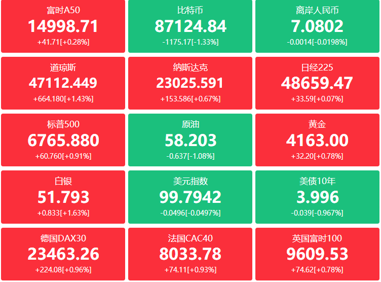 外汇:美元指数下跌0.45%报99.695点,美元兑日元跌0.50%报156.11日元,欧元兑日元跌0.11%,英镑兑日元大致持平;欧元兑美元涨0.36%报1.1563,英镑兑美元涨0.45%报1.3164,美元兑瑞郎跌0.09%报0.8077;澳元兑美元涨0.05%,纽元兑美元涨0.13%,美元兑加元跌0.05%。人民币汇率刷新逾1年来高位,在岸、离岸人民币对美元汇率双双收复7.09关口;比特币跌2.35%报87080美元,以太币跌1.38%报2935.50美元。