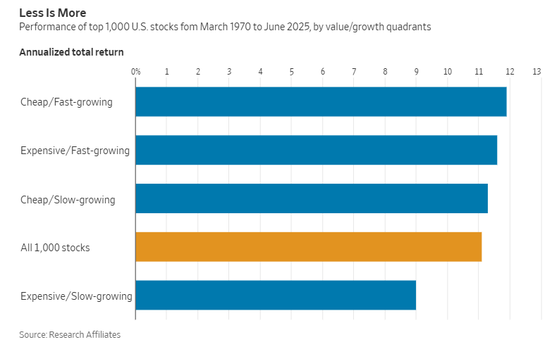 分析结果显示,价格便宜且增长快速的公司组合,年均表现比前1000大股票高出0.8个百分点。而那些增长缓慢且估值高昂的公司组合,年回报率比大盘低2个百分点。