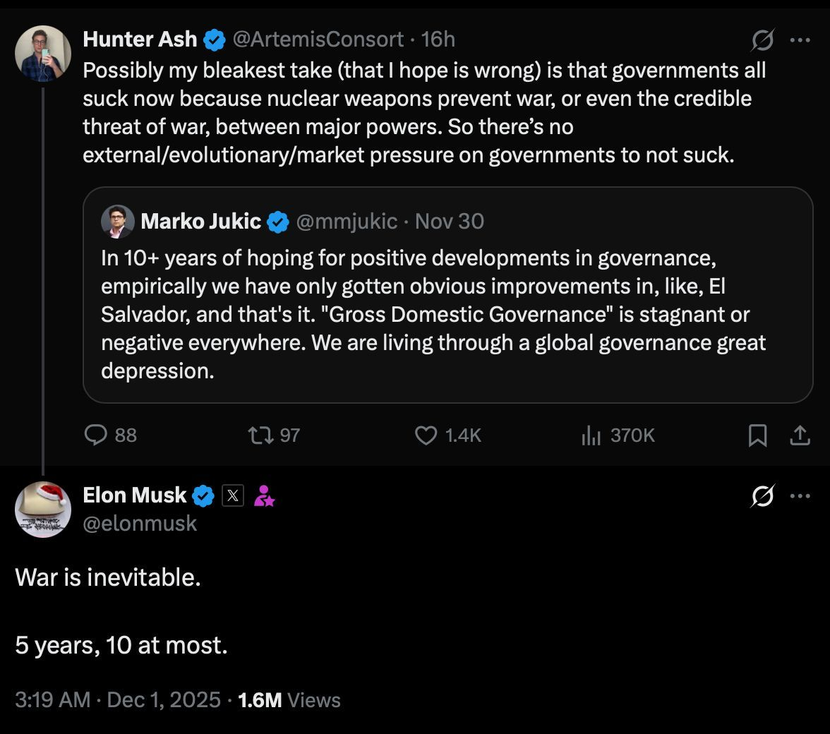 马斯克另一重磅言论:“战争不可避免,5到10年内爆发”在另一场引发热议的公开讨论中,马斯克于平台 X(前推特)上对核威慑与政府效率的讨论作出回应,表示:“战争是不可避免的。5年,最多10年。”