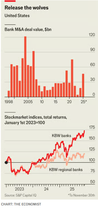 截至2025年,目前已宣布的银行并购交易总额约为470亿美元,是2023年和2024年两年总和的两倍多,且交易节奏不断加快:10月是自2019年以来交易最活跃的一个月。
