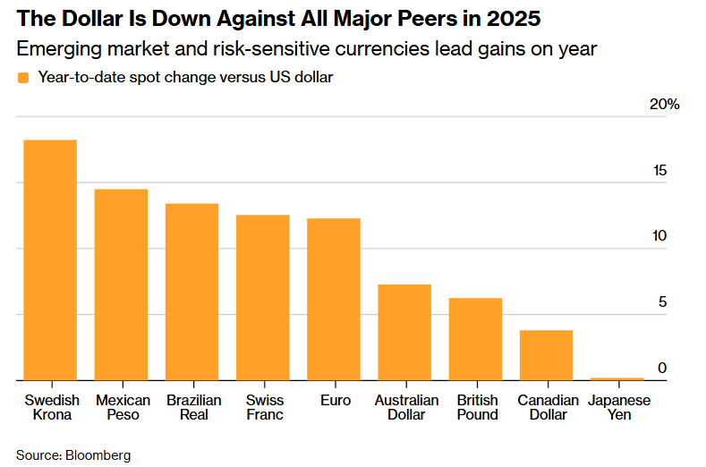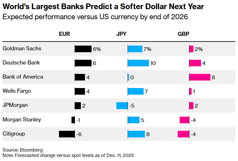 因此,超过半数主要投行的预测显示,美元将对日元、欧元和英镑等主要货币走弱。根据彭博汇总的共识预期,一项广受关注的美元指数到2026年底预计将下跌约3%。