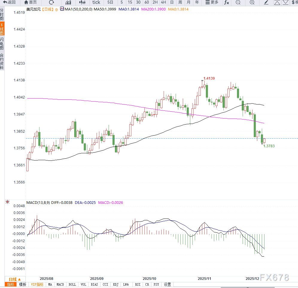 日线图上来看,美元兑加币维持1.3800附近弱势格局,整体呈现空头控盘迹象。K线持续在五日均线下方运行,显示反弹动能有限。MACD保持死叉状态,空头能量柱扩大;RSI徘徊在中性偏弱区域,未出现超卖,意味着仍有进一步下探空间。