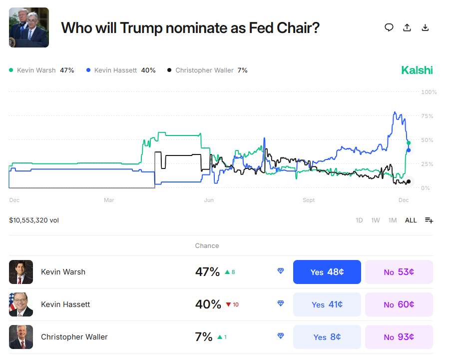 截至撰稿,哈塞特在Kalshi上的胜出概率约为 40%,较本月初一度超过 80% 的高点明显回落;沃什的概率则升至 47%,跃居榜首,并较12月初约 11% 大幅攀升。