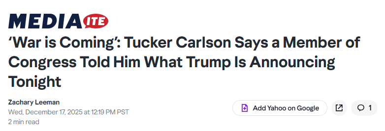 “有国会议员昨天被告知,一场(与委内瑞拉的)战争即将到来,并将于今晚特朗普的讲话中宣布,”卡尔森在节目中表示。相关文字记录随后在社交媒体上被广泛传播。