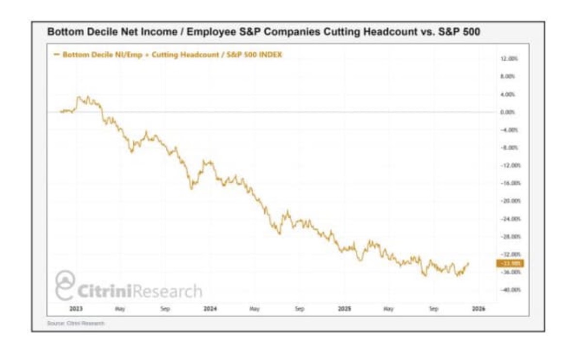 他们的筛选显示,那些“每名员工净利润”排名最低、且正在裁员的公司,股价表现落后于标准普尔500指数。