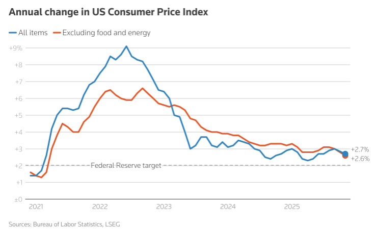 剔除食品和能源的核心CPI在11月同比上涨2.6%,此前9月为3.0%;截至11月的两个月内,核心CPI累计上涨0.2%。美联储以个人消费支出(PCE)价格指数作为2%的通胀目标指标。由于10月PPI报告取消,11月PCE发布时间尚未确定,相关数据仍明显高于目标。
