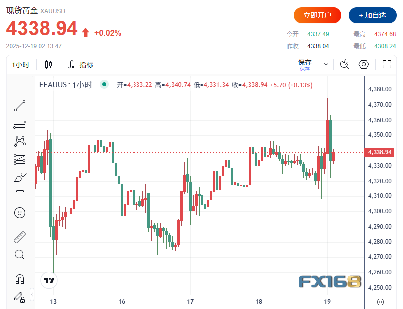 FX168财经报社(北美)讯 周四(12月18日),国际金价基本持稳,回吐早盘部分跌幅。此前公布的美国通胀数据低于市场预期,进一步强化了投资者对美联储将在2026年降息的押注。