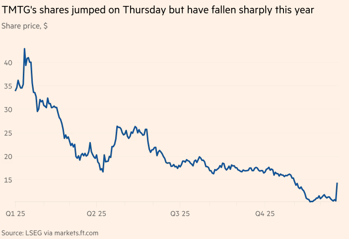 TMTG股价在周四(12月18日)美市早盘一度暴涨 33%,市值升至约 38亿美元。不过,从更长周期看,该股自 2024年3月通过SPAC上市以来,过去一年累计仍下跌近 70%,基本面争议并未消散。