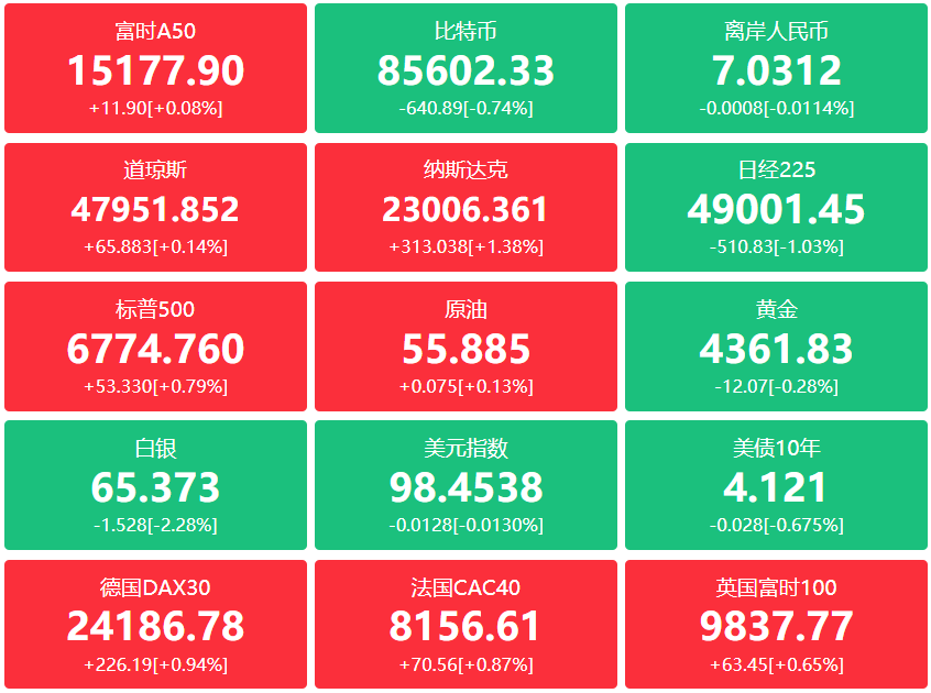 美东时间周四,在利好通胀数据的推动下,三大指数集体走高,结束了近期的下跌走势。截至收盘,道琼斯指数涨0.14%,报47,951.85点;标普500指数涨0.78%,报6,774.76点;纳斯达克指数涨1.38%,报23,006.36点。盘前公布的数据显示,美国11月CPI同比上涨2.7%,明显低于市场预期的3.1%;剔除食品和能源价格后的核心CPI同比上涨2.6%,同样低于3%的市场预期。