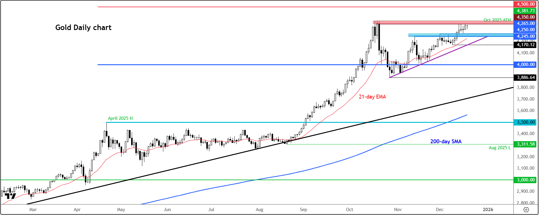 从技术面来看,黄金阻力最小的运行方向仍然是上行,出现向上突破并不令人意外。毕竟,金价在今年几乎一直处于“逆重力”上涨状态。因此,接下来重点关注是否出现双顶结构或假突破的情形。但只要高点上移和低点上移的结构仍然成立,从技术角度来看,黄金前景就依然偏向积极。所有关键价位均已体现在上方的黄金走势图中。