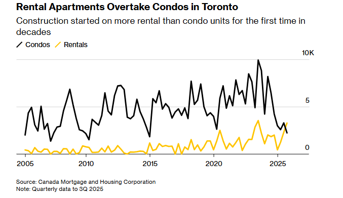 这种从公寓转向出租的趋势正蔓延至多伦多整个开发行业。2025年第三季度,多伦多新开工建设的出租公寓数量首次超过公寓项目,这是自1990年政府开始记录数据以来的首次。