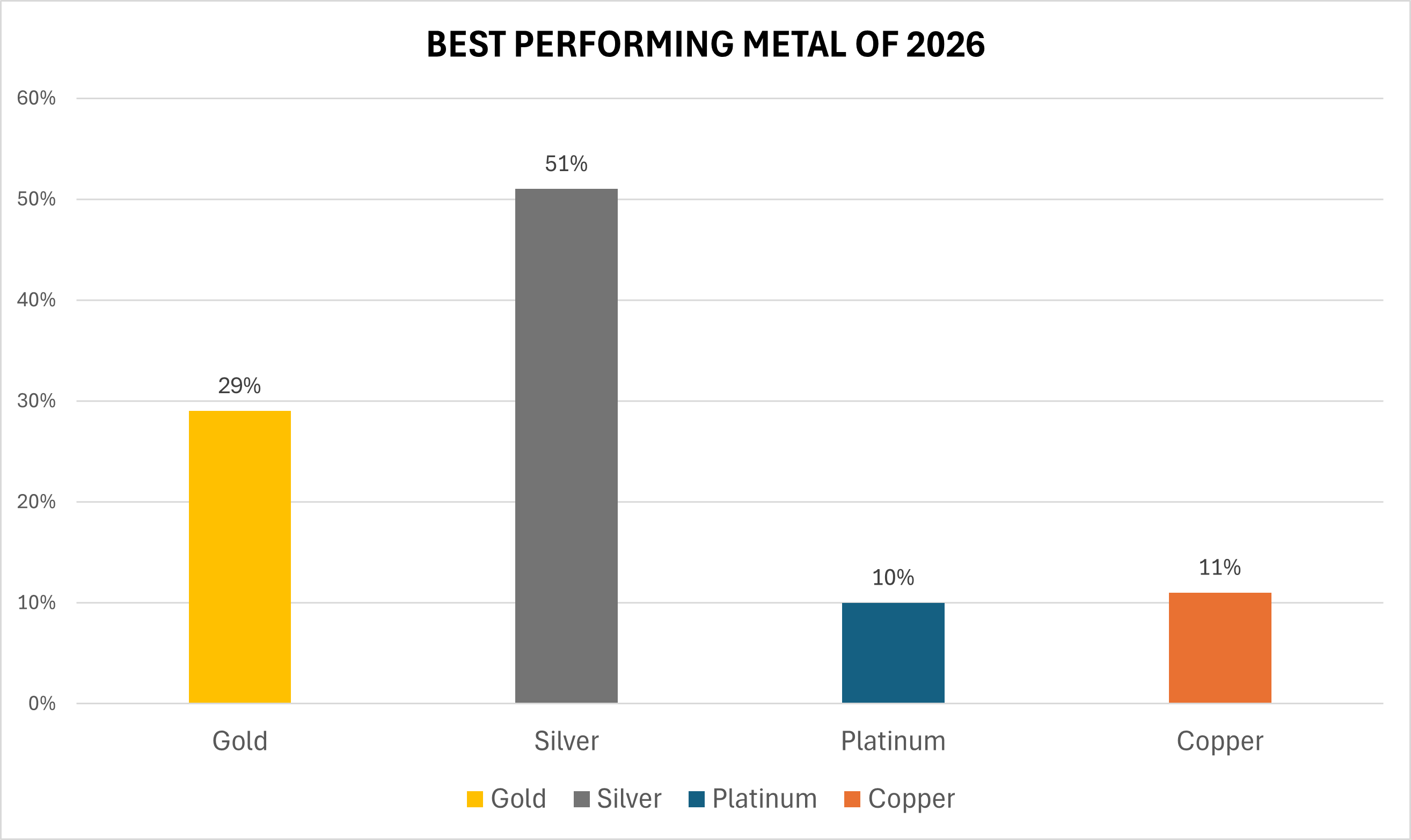 此外,约29%的受访者(101人)预计黄金将成为2026年表现最佳的贵金属;10%(36人)看好铂金;其余11%(37人)则认为铜价将在2026年跑赢其他金属。