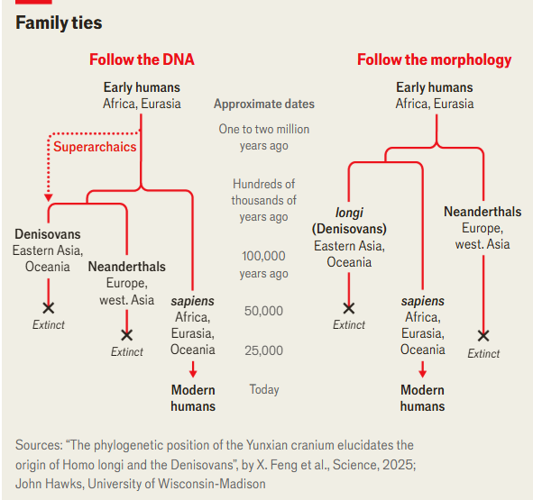 但若看外形特征(形态学)——如牙齿、脑壳、前额和眉骨等,则讲述的是完全不同的故事。倪喜军与英国自然历史博物馆的克里斯·斯金纳认为,龙人与智人的祖先在尼安德特人与其分化之后才分家。