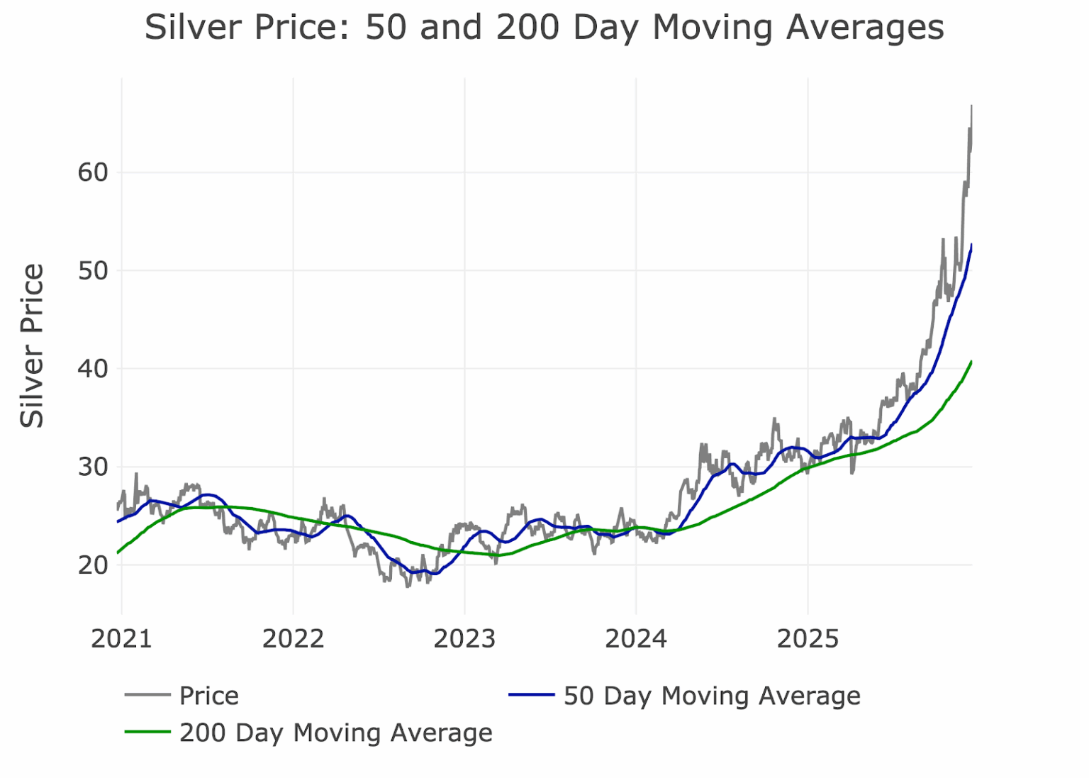 不过,价格连续单边上行并不可持续。若金银价格以“直线上涨”的方式逼近黄金5000美元、白银100美元等重要里程碑,反而可能构成典型的“加速冲顶”信号,增加随后深度调整的风险。从健康牛市的角度看,阶段性横盘或温和回调,更有利于趋势延续。