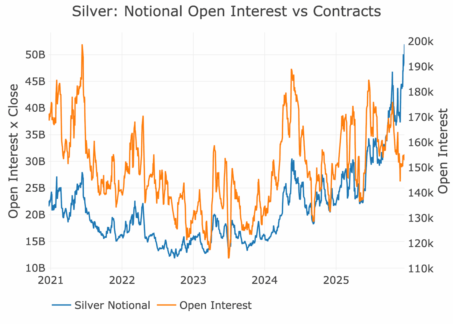从COMEX持仓数据看,近期金银价格上涨并未伴随显著的未平仓合约扩张,显示推动行情的并非典型的高杠杆投机资金。