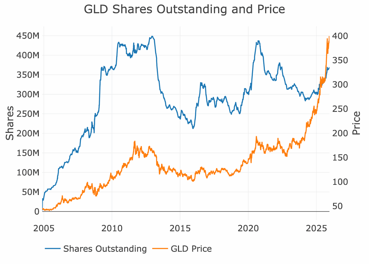 从ETF角度观察,GLD与SLV的份额变化显示,零售资金虽开始回流,但整体参与度仍明显低于2020年以及2010—2012年的高峰时期。