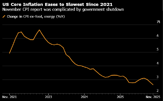据美国劳工统计局数据显示,11月份美国核心消费者物价指数(CPI)跌至2021年初以来的最低水平。总体CPI和核心CPI均出现下滑,但经济学家警告称,长达43天的政府停摆可能会扭曲劳工统计局工作人员为此次发布的数据。