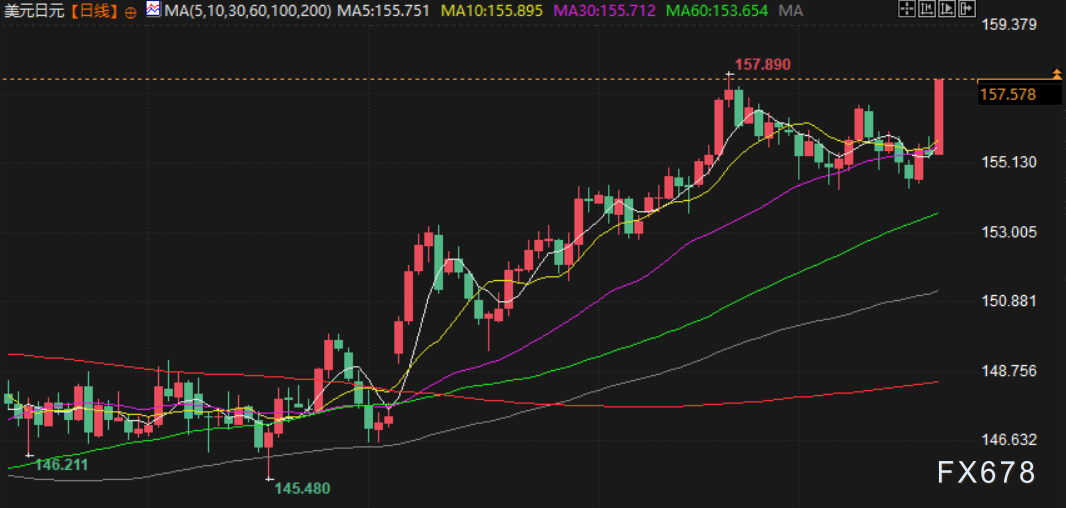 美元兑日元周五上涨,最高升至157.76,为四周来最高水平,创下10月初以来最大单日涨幅。