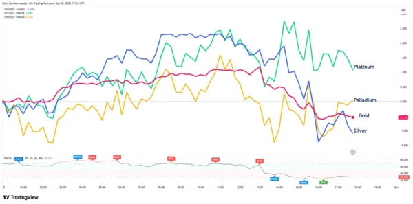 外汇市场方面,美元指数在2026年开局小幅回升,周五上涨0.12%,对去年多数时间偏弱的走势形成短线修复。欧元则下跌0.11%至1.1732美元,主要受到欧元区制造业跌至九个月低位的拖累。尽管如此,欧元和英镑均刚刚经历自2017年以来最强劲的年度涨幅。