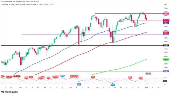 技术图表焦点:标普500回撤逼近关键“共振支撑”从技术面看,标普500过去5个交易日出现较明显回撤,目前逼近关键支撑区域:100日均线 上升趋势线共振区域约在6800点附近,市场可能在此形成“更高的低点”后再度上行。