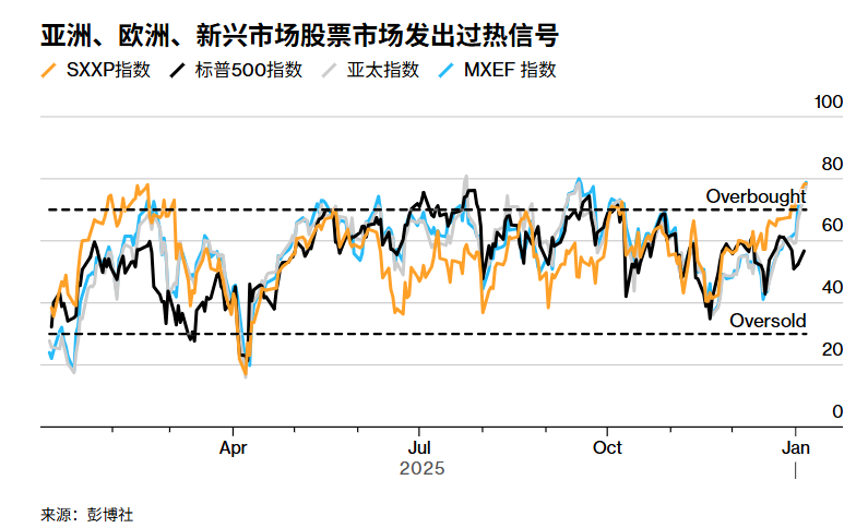 标普500的14日相对强弱指数(RSI)也显示,美股当前仍有进一步上涨空间;这与亚洲、欧洲和新兴市场股市普遍超买形成对比。