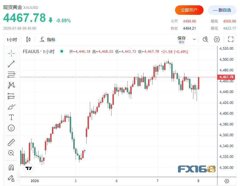 日内稍早,现货黄金一度下跌约1.5%,触及4,423.17美元/盎司的日内低点,随后跌幅收窄,最新下跌不到0.6%,交投于4,467美元/盎司一线。分析人士指出,金价此前连续拉升后积累了较大浮盈,短线回调更多体现为技术性获利了结。