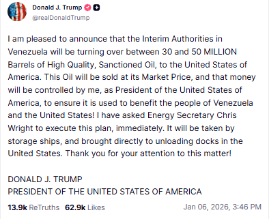特朗普在社交媒体发文称:“这笔钱将由我——作为美利坚合众国总统——进行控制,以确保其用于造福委内瑞拉人民以及美国人民。”