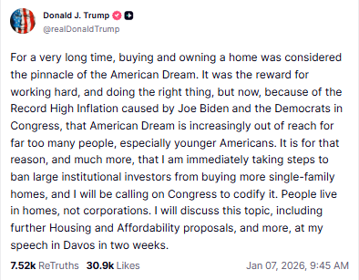 特朗普在Truth Social发文称:“长期以来,买房与拥有住房被视为美国梦的巅峰——它是努力工作、做正确事情的回报。但如今,美国梦正越来越遥不可及,尤其是对年轻美国人来说。”他补充称:“正因如此,以及更多原因,我将立即采取措施,禁止大型机构投资者购买更多独栋住宅,并将呼吁国会将其立法固定下来。房子是给人住的,不是给公司买的。”