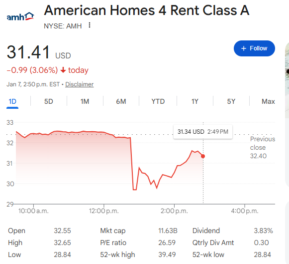 市场随即出现明显反应。特朗普发文后,黑石股价一度下跌9.3%;独栋住宅租赁领域的代表性公司Invitation Homes一度下跌约9%;美国单户住宅租赁公司AMH短线下挫并触发交易暂停。此前,Invitation Homes曾与黑石存在股权渊源,被视为独栋租赁产业链的重要标的之一。建材供应商Builders FirstSource股价下挫约5%。