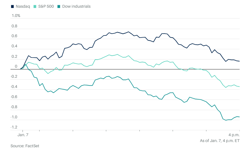 标普500指数和道琼斯指数在周三无力上涨,2026年来首次收跌。道琼斯指数下跌473点,跌幅1%,标普500指数下跌0.3%,都终结了连续三天的上涨走势。纳斯达克指数表现稍好,收涨0.2%。反映中小企业股票表现的罗素2000指数下跌0.3%。
