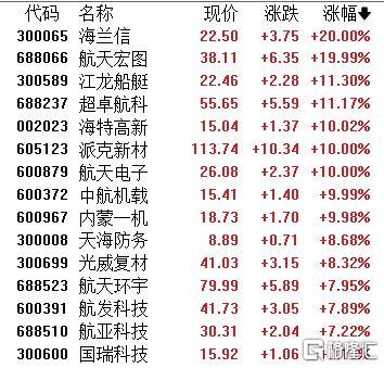 具体来看:军工装备、军工电子等板块领涨,海兰信、航天宏图20CM涨停,江龙船艇、超卓航科、海特高新、派克新材、航天电子、中航机载、内蒙一机、天海防务等跟涨。