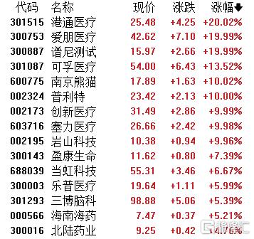 脑机接口概念震荡回升,港通医疗、爱朋医疗、谱尼测试20CM涨停,可孚医疗、南京熊猫、普利特、创新医疗、塞力医疗、岩山科技、盈康生命等跟涨。