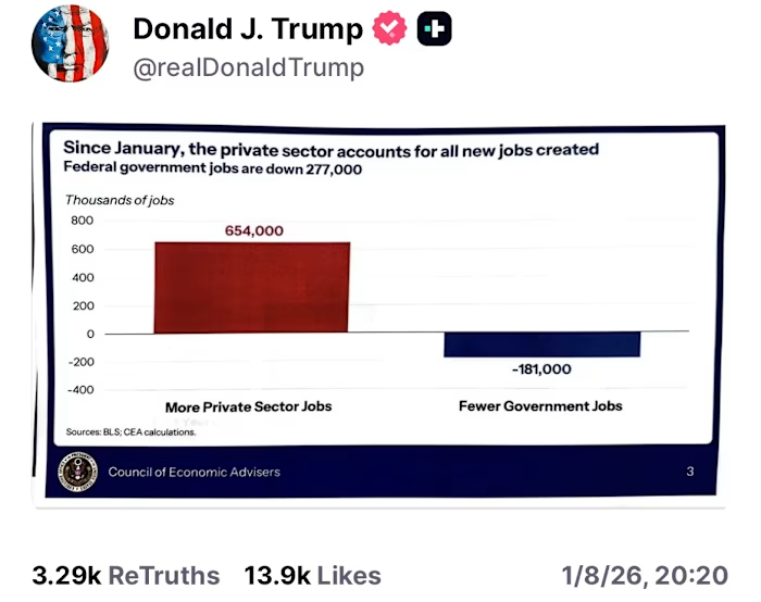 纽约时间周四(1月8日)晚上8:20,特朗普在其Truth Social平台发布了一张图表,显示自2025年1月以来,美国私营部门新增就业65.4万人。