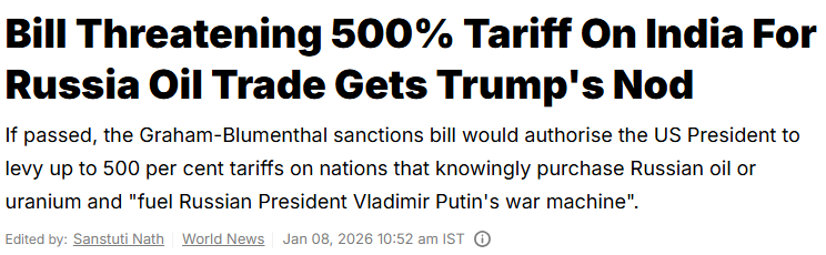 FX168财经报社(北美)讯 美国总统特朗普被曝已支持一项跨党派对俄制裁法案,该法案拟授权白宫对继续与俄罗斯能源部门进行交易的国家征收最高达500%的惩罚性关税,对象包括中国、印度和巴西。尽管法案仍处于推动阶段,但这一表态已在全球政治与市场层面引发高度关注。与此同时,印度外交部表示正“密切关注事态发展”,中国外交部则重申反对非法单边制裁,强调中俄正常经贸与能源合作不应受到干扰。