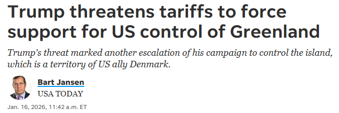 FX168财经报社(北美)讯 美国总统特朗普周五(1月16日)表示,如果有关国家“在格陵兰问题上不配合”,他可能会对其加征关税,称美国“出于国家安全需要格陵兰”。与此同时,美国最高法院预计将于1月20日发布下一批裁决,在多项重大案件仍待裁定之际,特朗普政府动用《国际紧急经济权力法》(IEEPA)实施广泛关税措施的合法性问题,也被市场视为焦点之一。