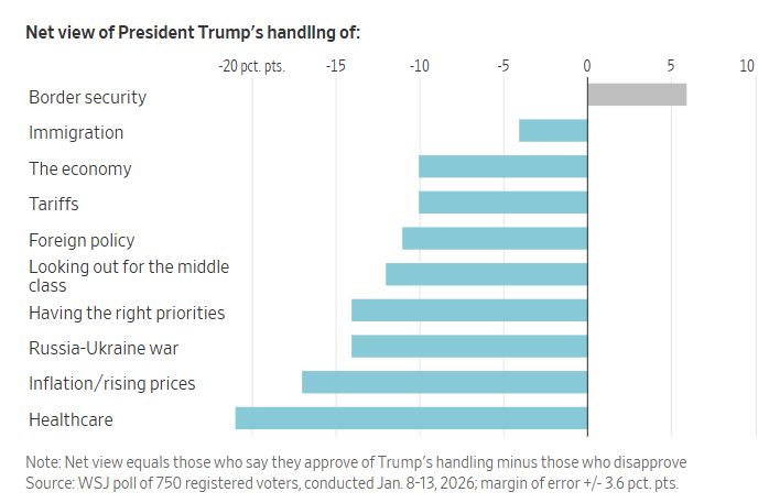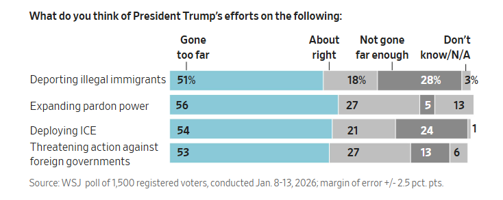 多数人表示不认可特朗普的执政重点,认为他并未真正关注中产家庭或“像你这样的人”。在被问及他是否把太多精力放在委内瑞拉、伊朗等国时,53%的选民认为他关注的是不必要的外交事务,牺牲了对经济的关注,只有42%认为他是在应对紧迫的国家安全威胁。