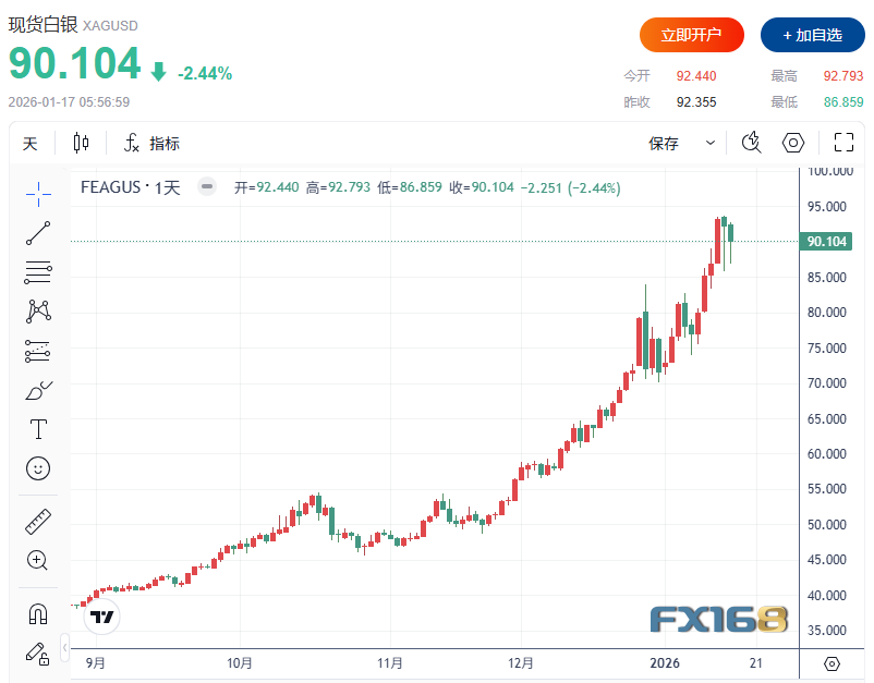 白银走势相似,但波动更为剧烈。现货白银收报90.104美元/盎司,本周大涨10.17美元或12.72%,但较周三峰值回落5%。