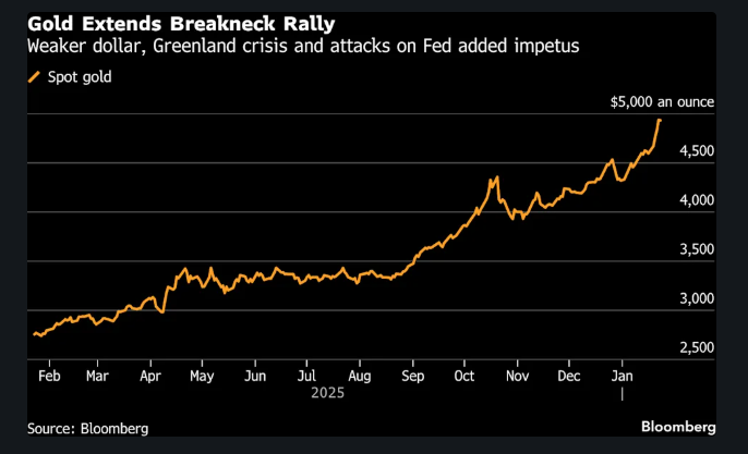 继去年出现自1979年以来的最佳年度表现后,黄金涨势持续,今年又进一步上涨了14%。特朗普再次抨击美联储,并在委内瑞拉展开军事干预,同时威胁吞并格陵兰,这些因素共同推动了所谓的“货币贬值交易”——投资者从主权债券和法定货币中撤出,转而寻求黄金等替代性避险资产。