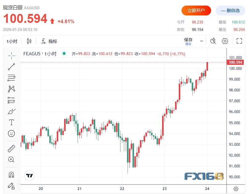 FX168财经报社(北美)讯 在地缘风险升温、美元走弱与市场对美联储独立性担忧加剧的背景下,白银周五盘中首次站上100美元/盎司关口,迈入“三位数时代”。避险资金与散户买盘同时涌入,推动银价延续强势上攻,而持续多年的供应缺口与工业需求韧性,则为这轮上涨提供了更深层支撑。